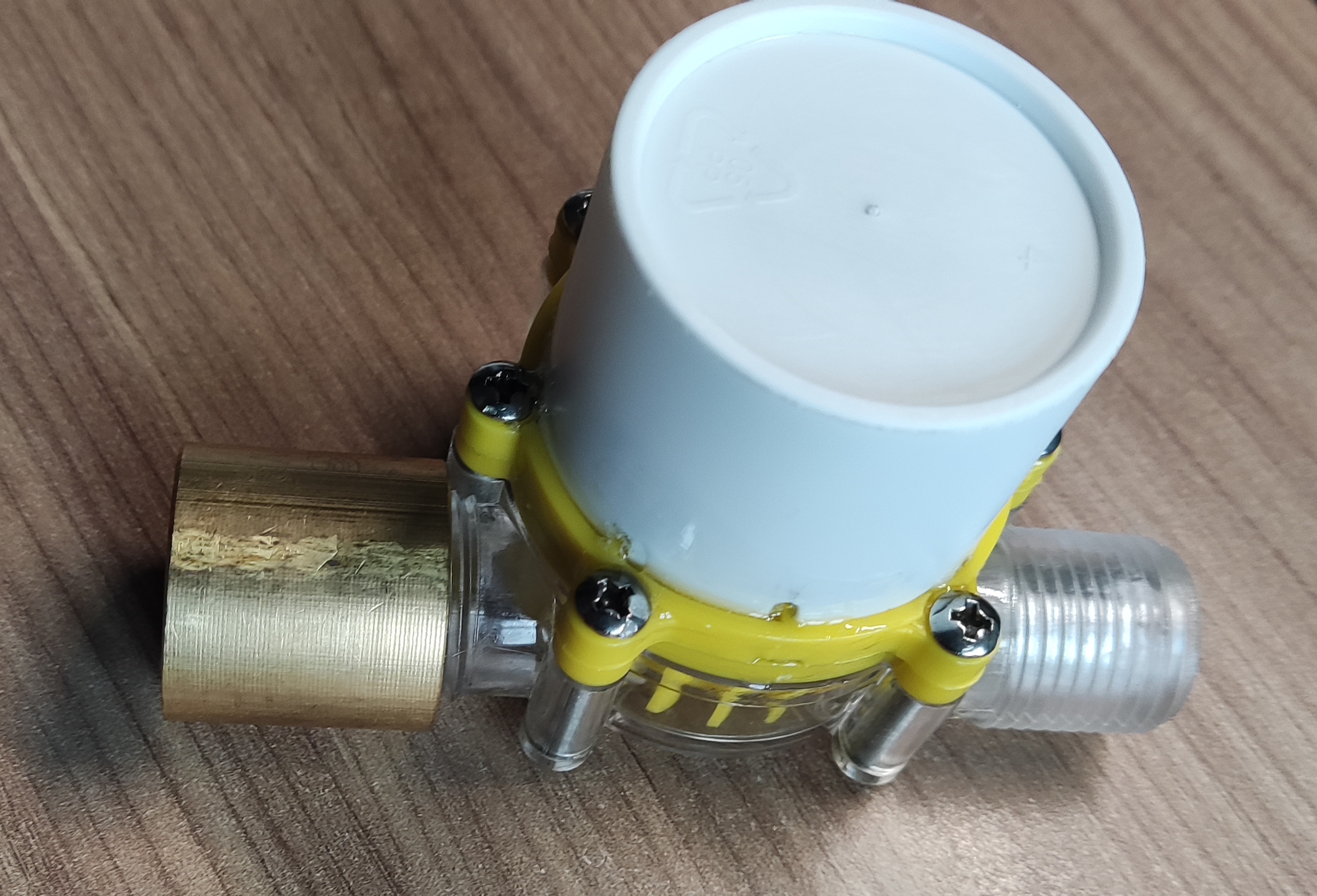 On testing it seemed that with only a modest water flow it could get to 12v; taking it apart later determined that there was a regulator and capacitor inside that help to regulate the voltage. Current to power a couple of LEds was quite sufficient.